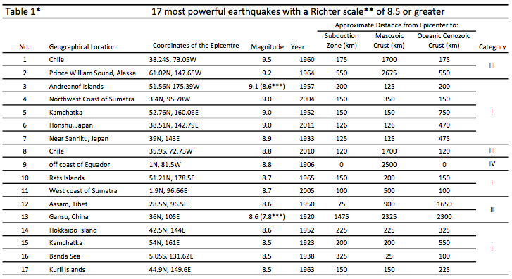 Table 1 presents an up-to-date list of the most powerful registered earthquakes (MPREs) and shows the approximate distances from their epicentres to the nearest Mesozoic oceanic crust (chron 29 and progressively higher chrons) and Cenozoic oceanic crusts (chron 29 and progressively smaller chrons), and also distances to the edges of the continental crust.